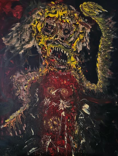 My technique is abit messy. I first create a background and then I usually use knifes and brushes with lots of paint on and kinda create thick layers that I then adjust. I often let it dry abit and then go for more layers and fix details with fine brushes.