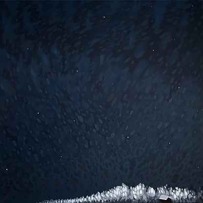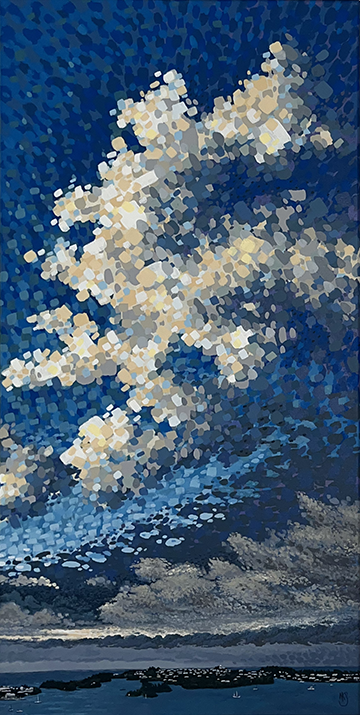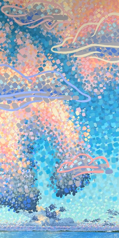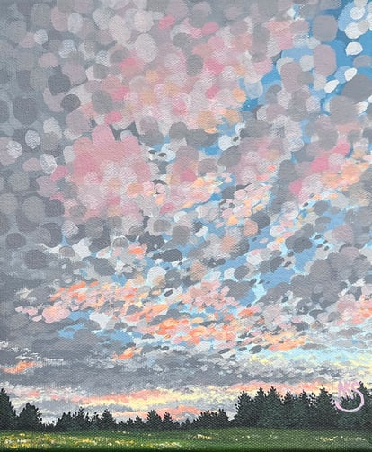Painting technique is inspired by an impressionist palette, using pointillism to create a surreal pixelated sky fading into a realistic horizon-line for grounding. Within each piece, I play with depth perspectives through stroke and hues allowing the audience different visuals depending on their proximity.